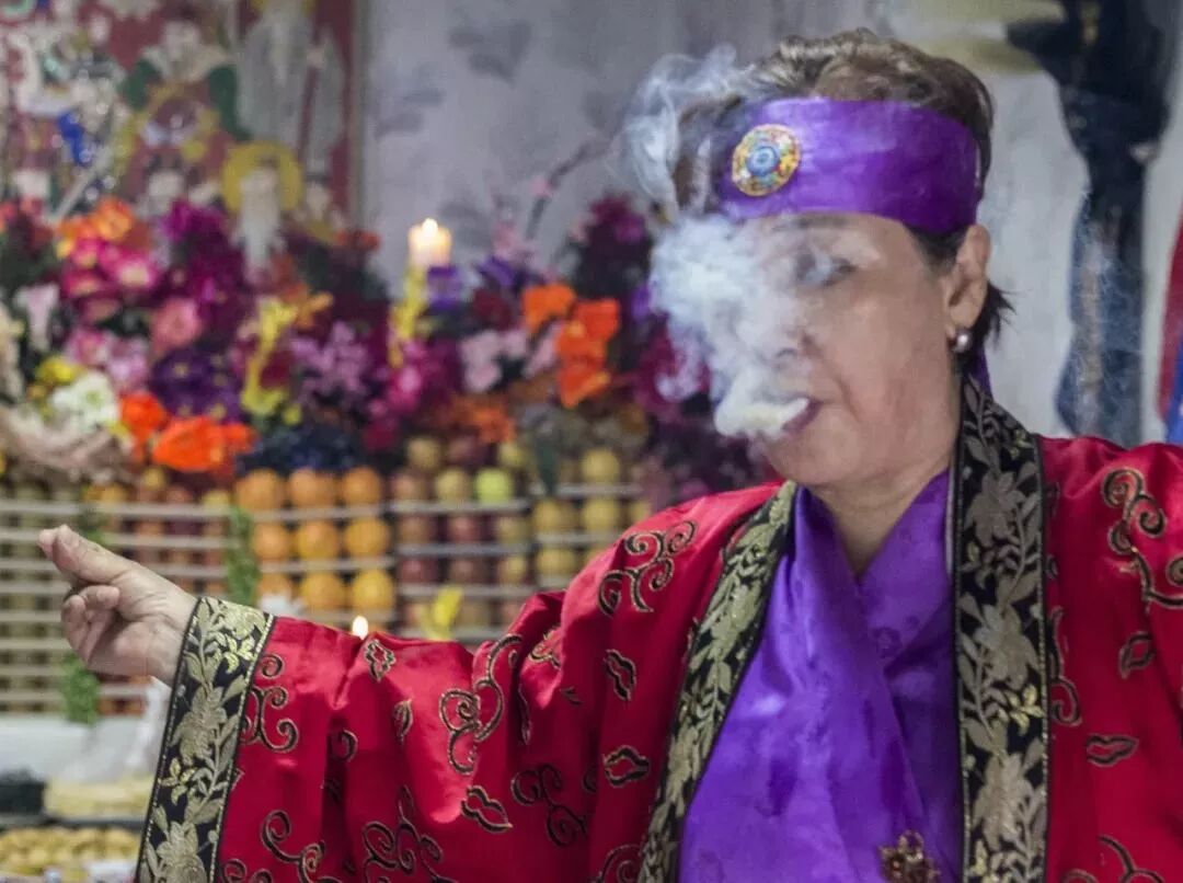 每当有人求治病或占卜,巫女在跳大神“神灵附体”时,会模仿麦克阿瑟附体:戴上墨镜、叼着雪茄烟,然后全身颤抖着念叨貌似英语发音一样的“预言”。