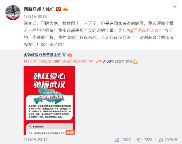 17年后,一场更猛烈的疫情来势汹汹,武汉封城,多地告急!在一个创伤累累的民族面前,我们无法再去高唱“多难兴邦”的论调,唯有风雨同舟,共克时艰。在这场全民“抗疫”战中,有业已84岁的钟南山亲赴武汉,体现了一名国士的担当;有广大的医务工作者冒着生命危险奋战在第一线;也有无数使命在肩的人在以各种各样的方式尽心竭力。最近,当歌手韩红慈善基金会将募集到的大量资金、大批紧急物资纷纷送到与运抵武汉时,这些年有关她做公益的争议终于尘埃落定:信韩老师!在她的感召和带动下,很多艺人纷纷向灾区捐款,此前,韩红已率领百人医疗队驰援武汉。▲ 参与捐赠的艺人(不完全统计名单) 图源:韩红微博沧海横流,方显英雄本色。当疫情肆虐时,小丑无处遁形,人性的光辉把深渊照亮。1月31日,操劳数天的韩红病倒,她在微博中写道:“在国家有难的时候,我必须像个军人一样的坚强着。”![]()