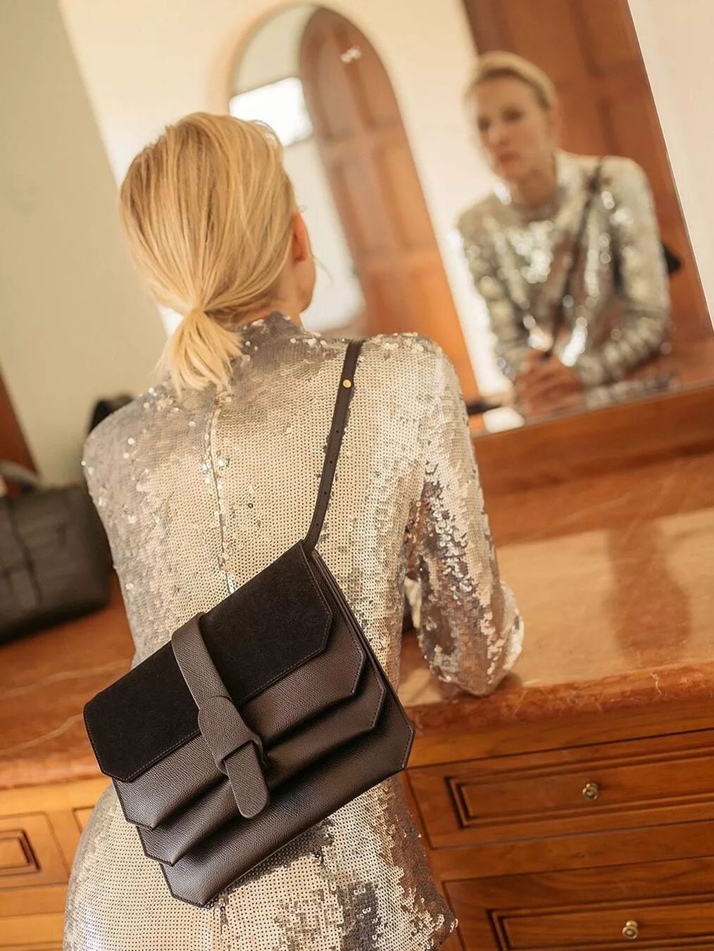 聚会时,用一只麂皮拼接款黑色Crossbody来平衡一身闪亮的银色鳞片长款连衣裙,将多种材质搭配出不同层次——时尚达人的称号,非你莫SHU!