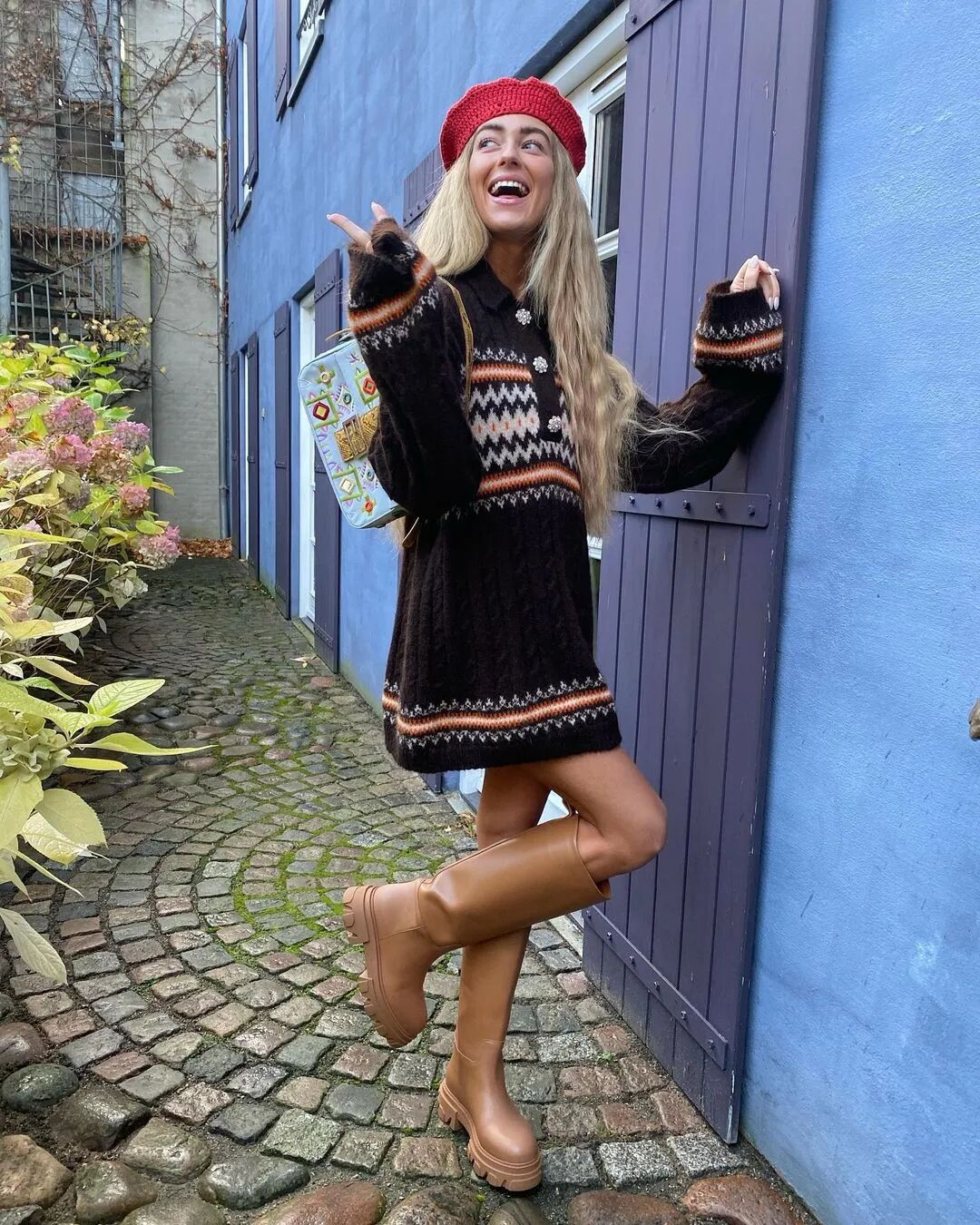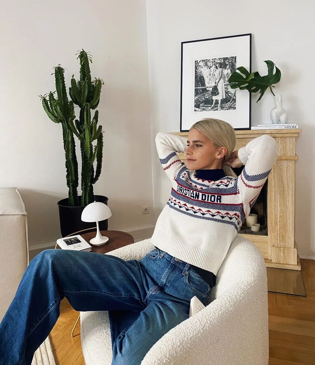 其实从上面的图片中不难发现,这种小面积图案点缀的费尔岛毛衣是最容易呈现出北欧风特有的简约和清爽特质,毫无侵略感的米色搭配极具海洋风的深色,将大地色的那份独有的恬静和质朴融入其中,作为日常穿搭更是有满分的随性感。