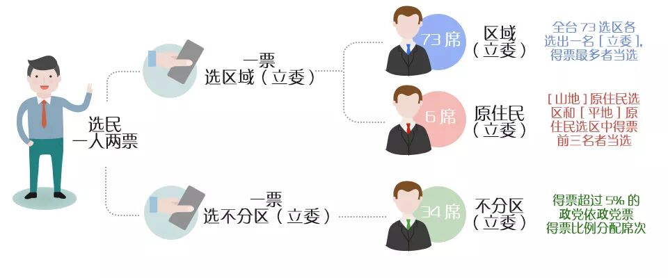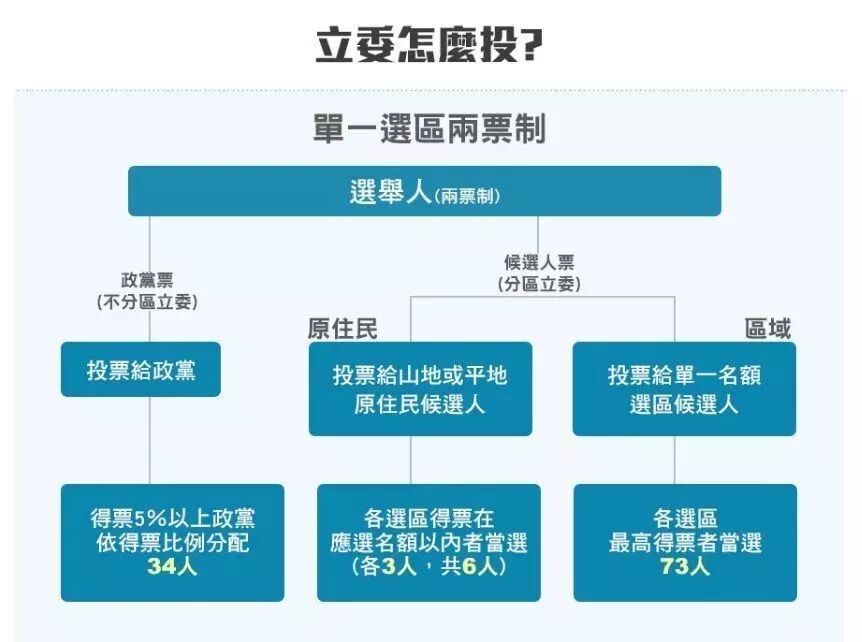首先,来让我们了解一下“立委”席次的构成:在全部113席“立委”当中,共有73席区域“立委”,6席原住民“立委”和34席不分区“立委”。区域“立委”与原住民“立委”由选票选出,不分区“立委”则由政党票得票比例分配席次。