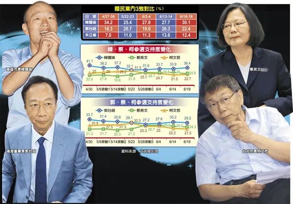 ▎6月台媒发布民调,当时韩国瑜支持度仍高于蔡英文,遥遥领先第2名的蔡英文达11.6个百分点。