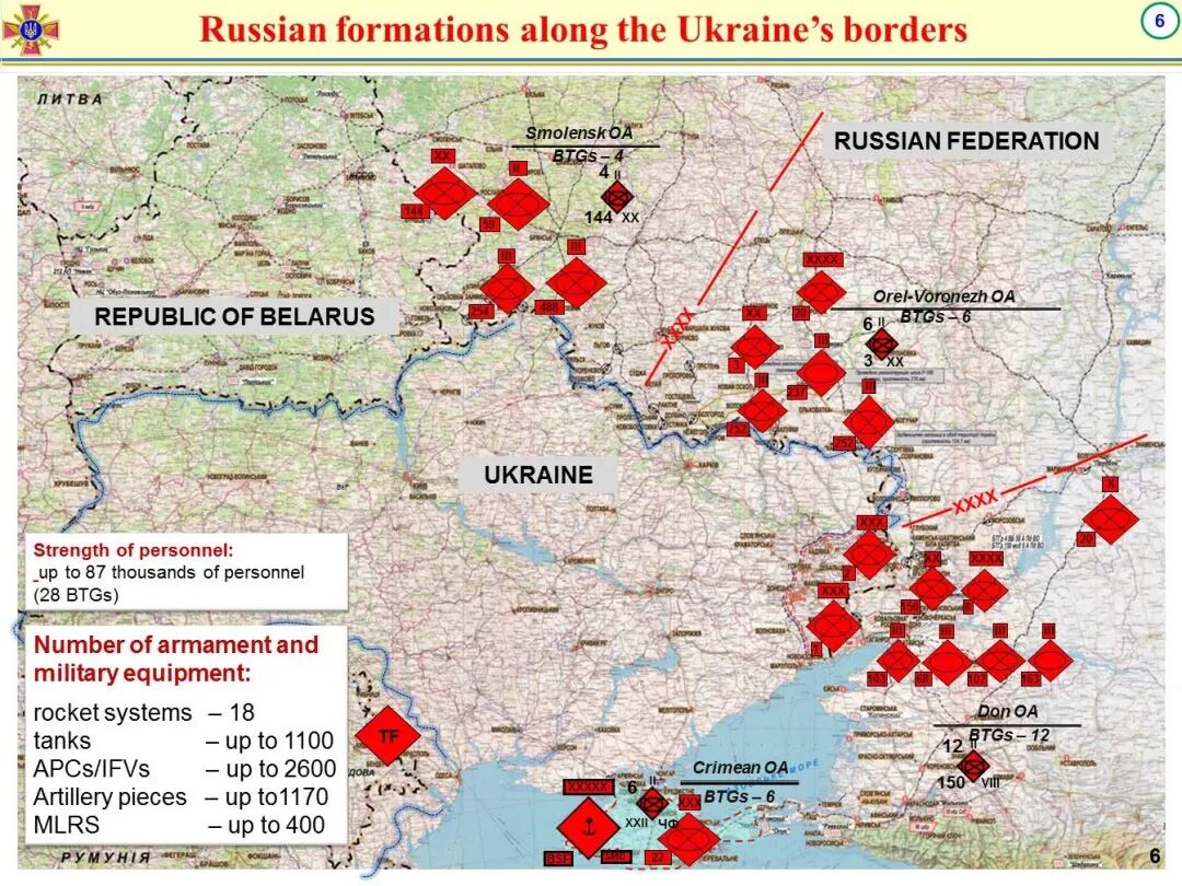 在之前的战略态势中,乌克兰军队把9个主战旅都调集到了东部顿巴斯前线,重兵云集。超出了这8年来乌军一般保持6个旅在前线包围两个俄族“独立共和国”的态势。