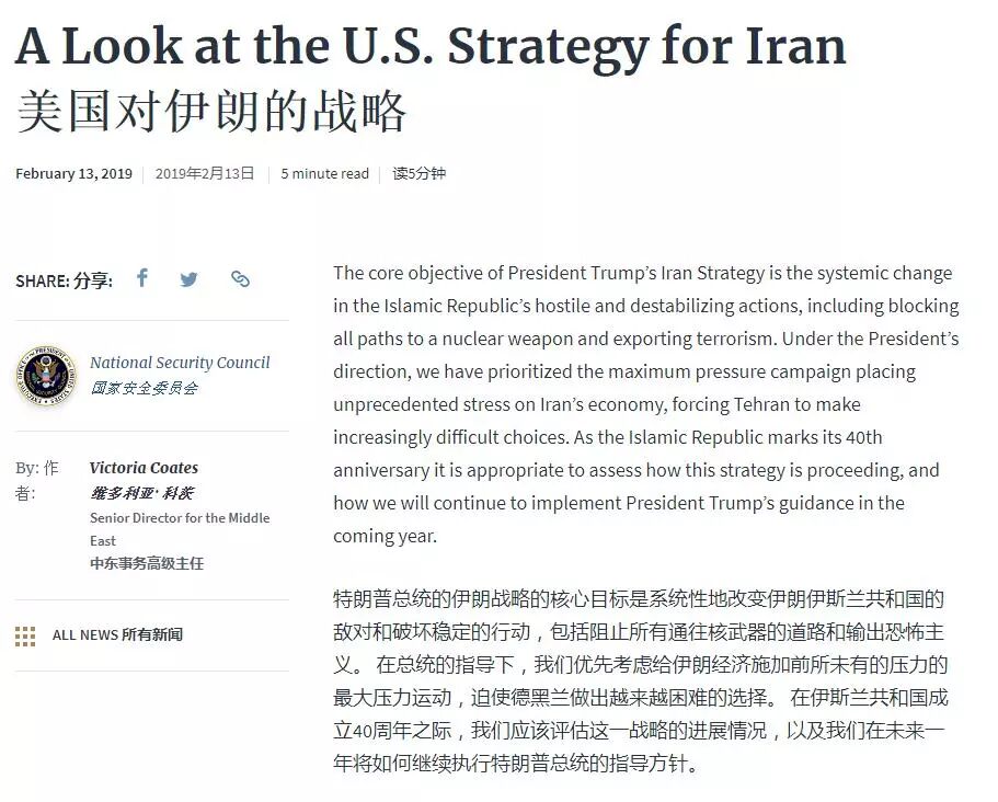 2019版对伊朗战略。图源:美国白宫政府网站
