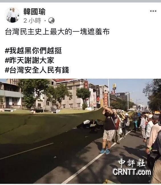 ▎图自中评社。罢韩人士声称有50万人,实际官方统计只有2.5-4万,挺韩有6-10万,故韩国瑜讥讽罢韩者用布条充人数。所以,无怪乎民进党开始进行反渗透法的极限操作,很容易让人想到2004年两颗子弹。但此次形势更为复杂,你死我活之中,小绿时代力量怒轰民进党、白色柯文哲也就着高雄债务追打陈菊。若王金平、郭台铭再因反渗透法回归,最终选战将更加精彩。(本文综合自环球网、观察者网、风传媒、中评社、联合早报等)