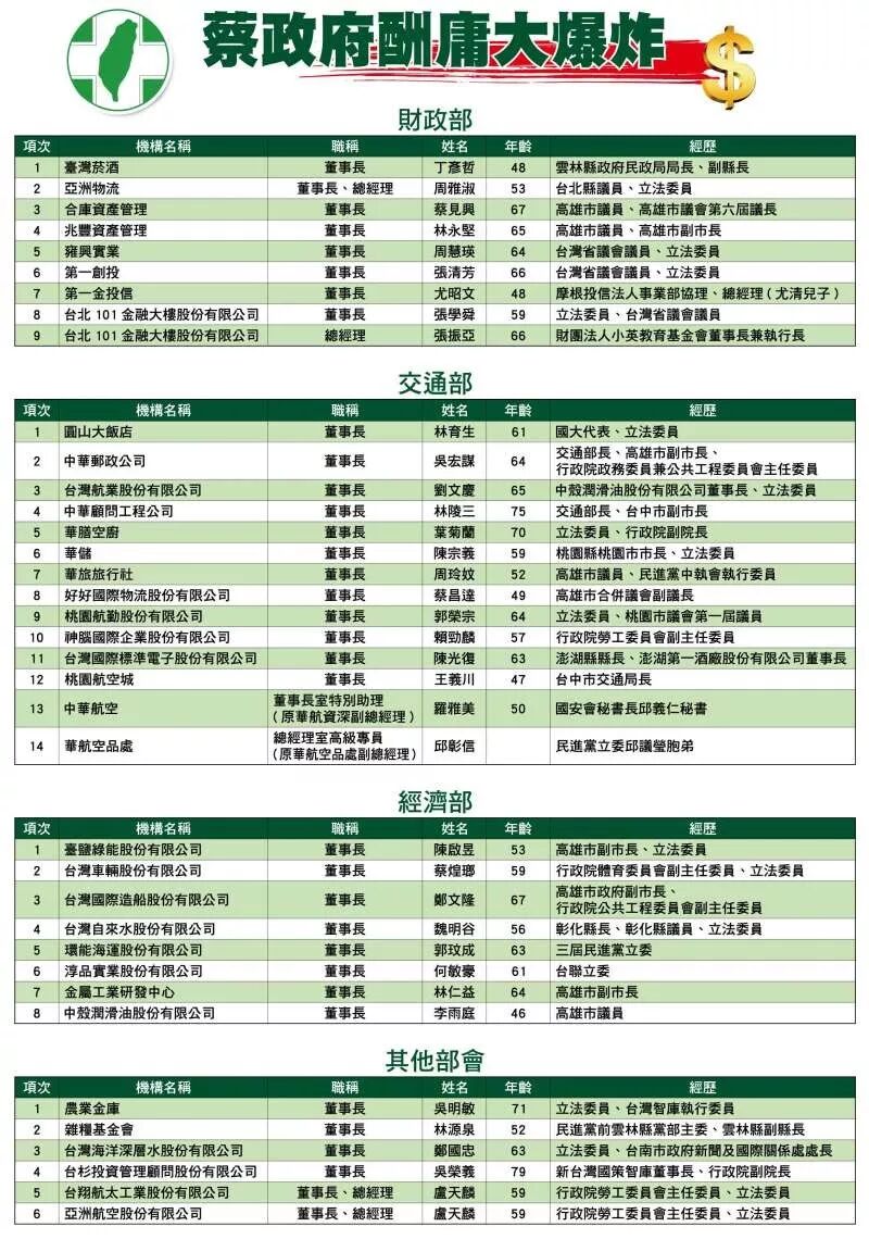 ▎图片来自联合早报特侦组可能各位读者有所耳闻,这是2007年4月2日于陈水扁任内成立,专责侦办台湾地区领导人、台湾地区副领导人及“五院院长、立委”等党政高层贪污或重大经济舞弊案,也包括在选举中的舞弊事件或妨害选举等等。本意是在不受高层职权压力下侦办特殊重大案件,曾经侦办了扁家洗钱案、拉法叶舰采购弊案、近两百名首长特别费案等外界叫好的案件,但也因为监听王金平卷入马王“九月政争”案,引发了无人监督的问题。到蔡英文上任,以机构重叠、考虑不周等理由裁撤特侦组,职能回到各“地方检察署”,人们本以为蔡英文会行得正坐得直,却不料成了酬庸大王。民进党早前提出人事要年轻化、不酬庸,但胜选之后全部食言。先是根本不存在的年轻化:据国民党立委江启臣统计,民进党委派的相关董事长、总经理、董事、监事初任年龄超过62岁的达212人,65岁139人,70岁的高达70人。国民党筛查民进党相关任命中,除了专业适当名单外,有37人是毫无专业、只有政治考量的酬庸官员。