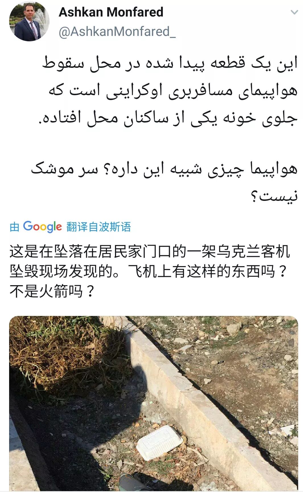 伊朗官员等在事发不过半个小时之内,就立刻迫不及待地宣布飞机是由于“技术故障”坠毁,这非常反常,此时坠毁现场都还没到,凭什么判定是技术故障的?![]()