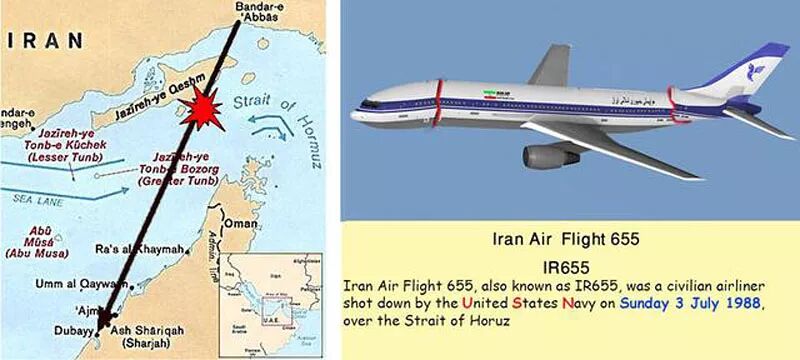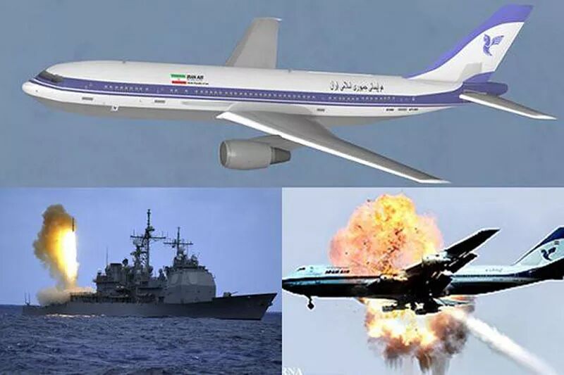 当时在波斯湾护航的美国海军导弹巡洋舰“文森斯”号(USS Vincennes)以为是来袭的伊朗F-14战机,发射2枚“标准”-2舰空导弹,将客机击毁。![]()