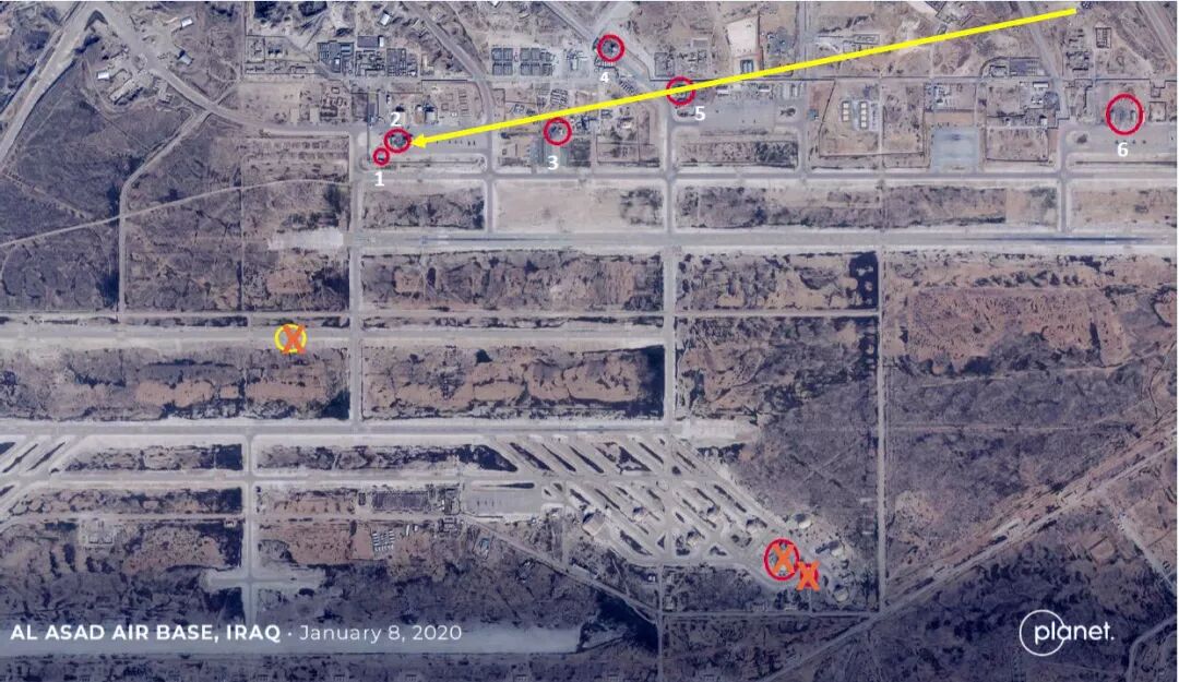▎美军阿萨德基地的总体命中图,9个点被击中,除了机库外,就是跑道,没有营房而美国只损失了去年年底火箭袭击的1名承包商,昨天夜间导弹袭击的几个机棚和1~2架无人机而已。![]()