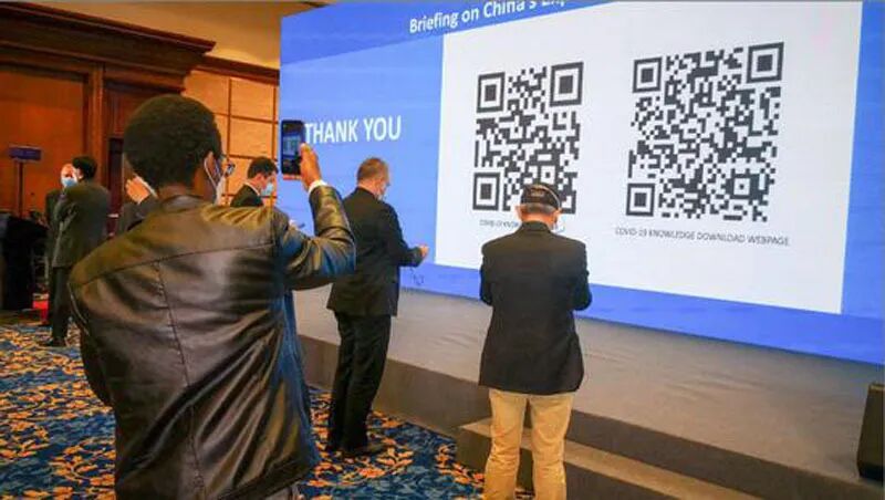 ▎各国外交代表现场扫描二维码,第一次下载中方提供的、已经完善到第七版的公开《诊疗方案》(英文版)