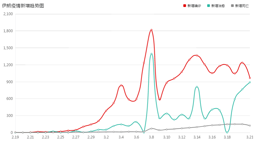 由于伊朗的“软性”隔离以及民众的生活方式,虽然到3月8日出现了新增人数高峰,但此后的下降趋势不明显,近日来始终维持着每日约1000人的新增规模。