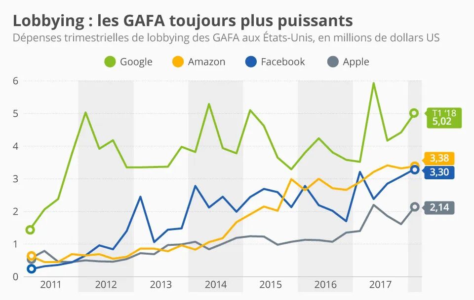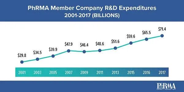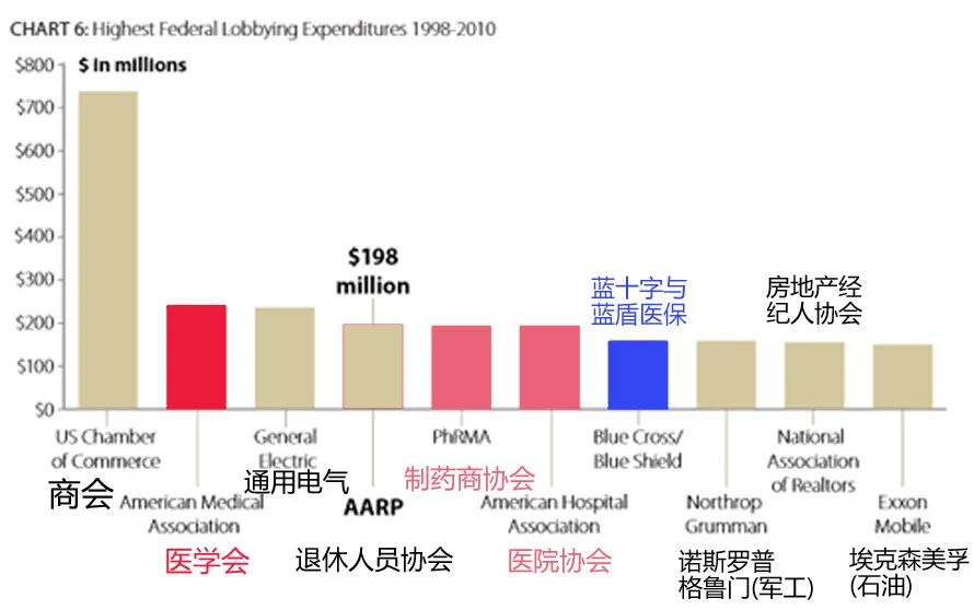 在非商业PAC之外,真正的大头还是商业类PAC。最大的商业PAC是美国商会(US Chamber of Commerce)。这是美国各地方商会、同业公会和专业协会的总联合组织,每年要花费6亿美元以上的政治游说经费,目标是致力于限制政府的权力、减少政府的干预。而医疗界的医生、药商、医院三大利益集团代表,则分别是美国医学会(AMA)、美国制药研究与制造商协会(PhRMA)和美国医院协会(AHA)。虽然目标局限于维护本行业利益,美国医疗界在PAC界相对不那么引人关注(有排名分别将他们列为第六、第七和第八),但闷声发大财本来也就是他们的目的。▎1998~2010游说支出最高的PAC排名实际上,AMA、PhRMA和AHA的实际游说花费,分别排名第二、五、六位,每年都要花费2亿美元以上。尤其是代表医生利益的美国医学会AMA,是仅次于美国商会,高于GE、AARP乃至众多军工、石油集团的美国第二大政治游说利益集团。AMA为何如此强势,在维护医生利益方面几乎无往而不利,秘诀就在于此。▎谷歌、亚马逊、脸书、苹果4家巨头的年游说费在千万美元量级比较一下,2018年,谷歌游说花费2000万美元,亚马逊1400万美元,Facebook 1200万美元,苹果660万美元——几大互联网巨头加在一起,还不够一家医药集团花费的一半。总而言之,美国医药利益集团和美国政治精英集团(尤其是共和党),就是最典型的官商勾结案例——撼山易,撼医药难!