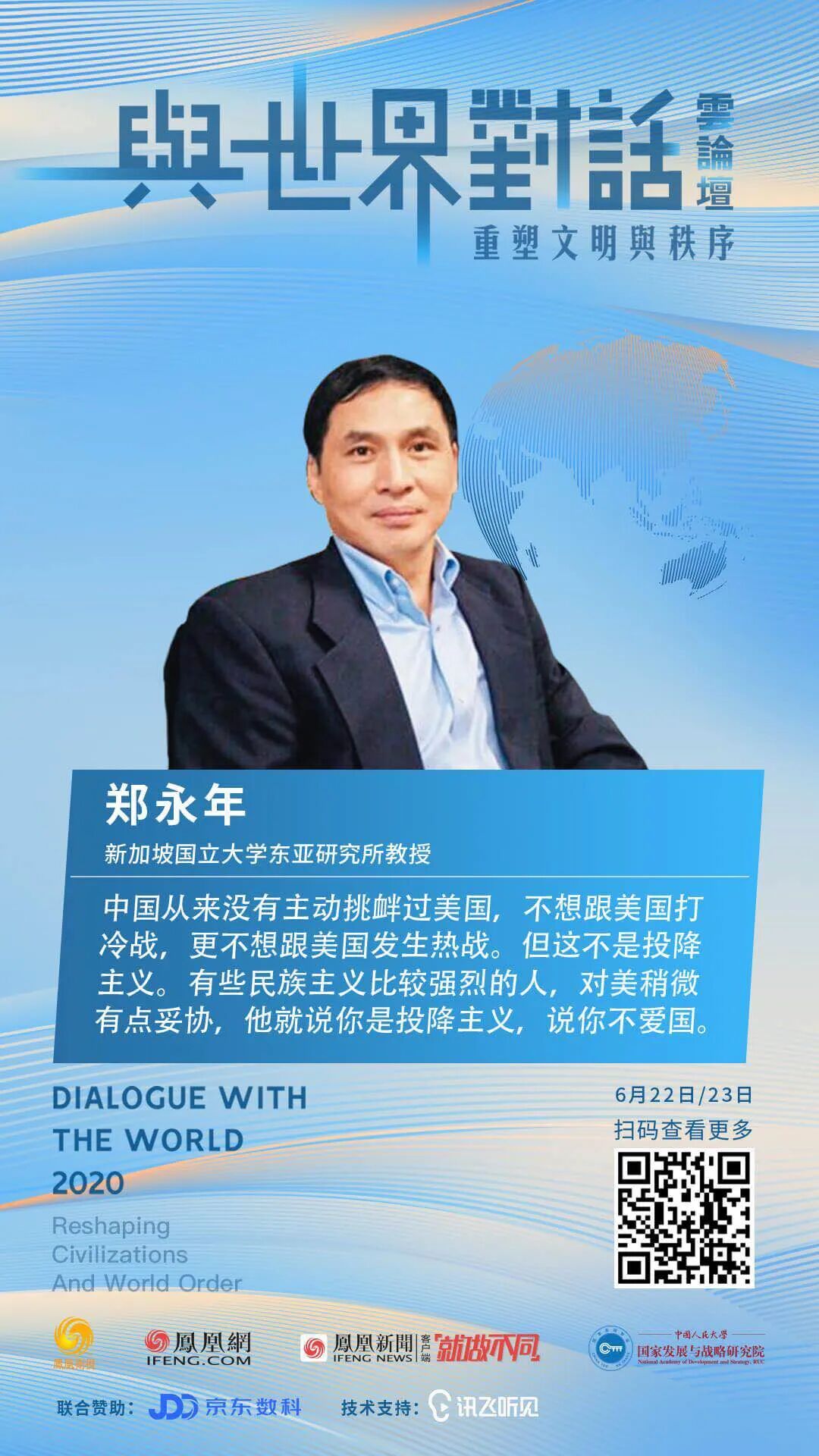 后疫情时代,中美关系与世界秩序会发生什么演变?在凤凰网“与世界对话”云论坛上, 新加坡国立大学东亚研究所郑永年教授就中美如何避免陷入“修昔底德陷阱”?面对欧美种族歧视,6000万海外华人如何自处?疫情之下全球化这条路是否还能走得下去等热点问题发表了精彩、独到的见解。