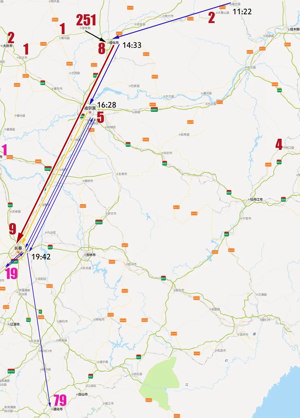 11日,长春疾控部门立刻展开轨迹调查,关联到了他们此前返长时乘坐的K350次列车11车厢。黑龙江省有关部门也即时回应了协查,推送了相关信息。 12日,作为理论上密接者的林某广,已经身处比长春还要往南240公里的通化。但当地还是立即找到了他,进行核酸检测,结果很意外,也是阳性。 对林某广的轨迹调查迅即开始。倒推到5日哈尔滨下车回家后,他已经连着跑了2次长春: