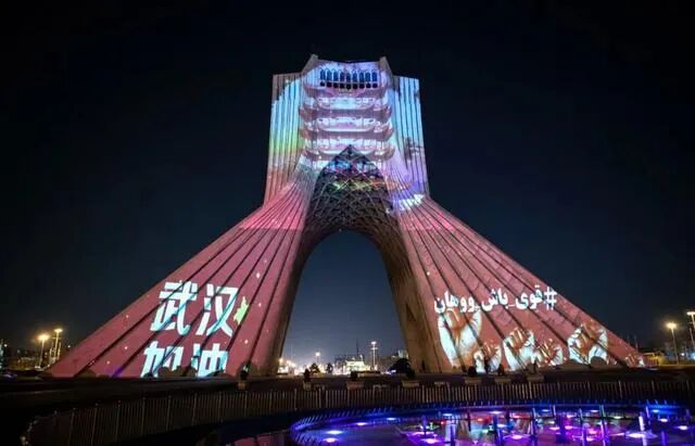 2月18日,伊朗首都德黑兰地标建筑自由塔上演灯光秀,为中国抗击疫情加油