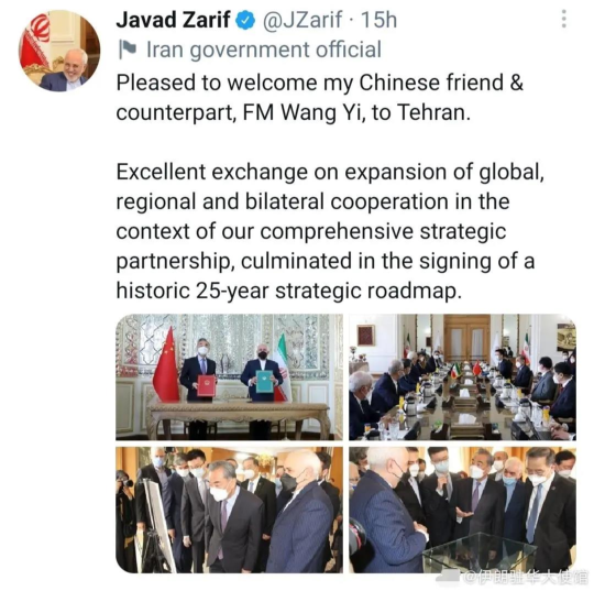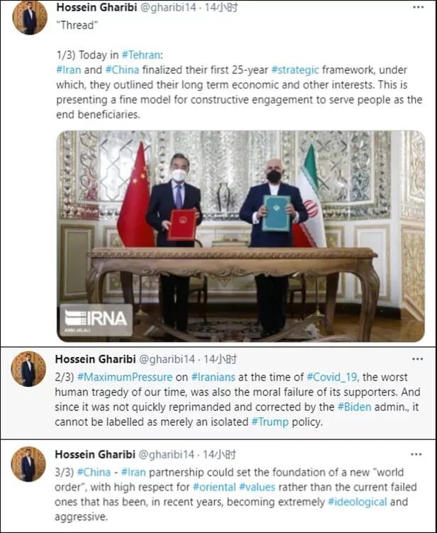 伊朗驻巴西大使加里巴(Hossein Gharibi)则在推特表示,伊朗和中国的伙伴关系将在高度尊重东方价值观的情况下,为新的“世界秩序”奠定基础。