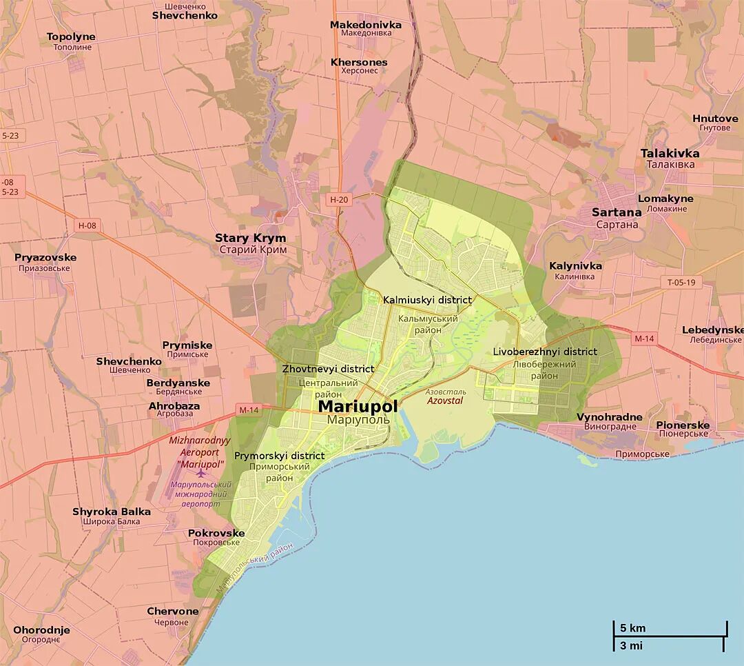 在东线,2月26日、3月1日俄军分别占领梅利托波尔、别尔江斯克,没有发生激烈交火。之前驻守这两个城市的乌军第37、40海军步兵旅(2019年组建)可能已经退守他处。2月25日开始,从东部罗斯托夫方向进攻的俄军摩步150师、DPR武装就开始围攻马里乌波尔。之后从西部别尔江斯克方向开来的克里米亚部队也加入了围攻。![]()