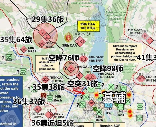 乌克兰军队迅速把这些河上的桥梁炸毁,阻止俄军的进攻。而俄军则开始试图架设门桥。乌克兰又出动特种部队,击毁了俄军工兵及架桥车。3月以来,俄乌两军一直在基辅西北郊的布查(Bucha)、伊尔平(Irpin)小镇交战。俄军空降兵的BMD空降战车车队已经至少三次在街道上被伏击,直至3月15日,又有一队空降兵的BMD空降战车被伏击。这种铝合金装甲的超轻型车辆是给空降兵提供机动火力支援的,基本没有什么防御力。与此同时,情报显示在空降兵后方还有俄军从远东调来的陆军摩步旅,分属于29、35、36几个集团军。它们一方面遭遇乌军南面增援的第61猎兵旅(日托米尔,指原驻地,下同)、第10山地突击旅(利沃夫)的袭扰,一方面在进攻正面却止步不前,大有观望的姿态。甚至有俄军部队躲进森林里消极避战,反而被乌军民用无人机引导炮兵打击的。![]()