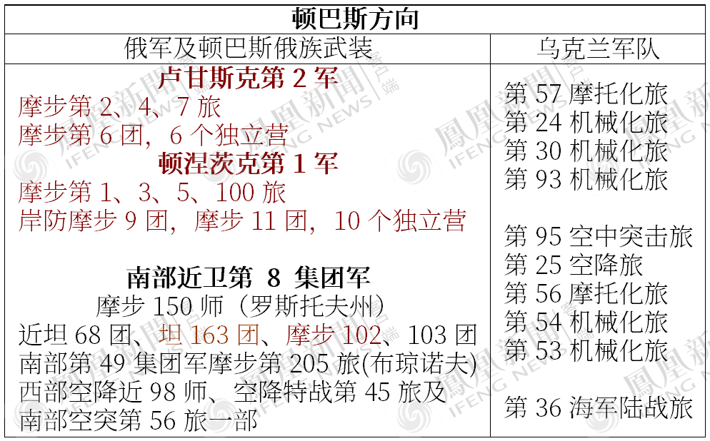 顿巴斯方向,乌军在战前就调集了超出平时6个旅轮战部队规模的9个机械化步兵旅。从北到南,战线依次是:第57摩托化旅、第24机械化旅、第30机械化旅、第93机械化旅(“卢甘斯克人民共和国”LPR方向)第95空中突击旅、第25空降旅、第56摩托化旅、第54机械化旅、第53机械化旅(“顿涅茨克人民共和国”DPR方向)![]()