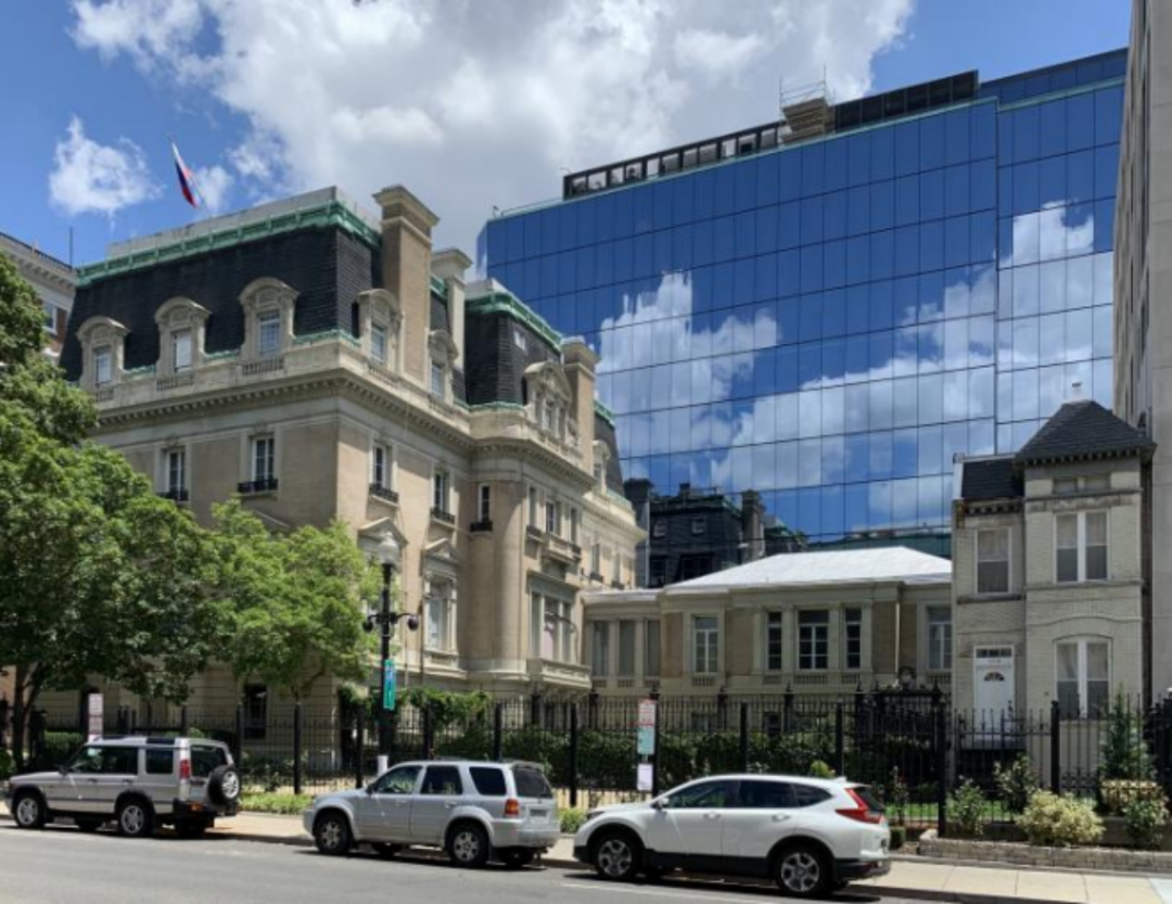 坐落在华盛顿特区西北16街上,有一栋被称为乔治·普尔曼夫人之家的古朴四层小楼。这栋1910年建造的小院,出自设计过白宫西翼和著名的椭圆办公室的传奇设计师,内森·科威斯·惠斯之手。110年前,这栋小院被俄国人买下,成为整个华盛顿市中心最喧闹的一角,俄罗斯和苏联驻美国大使馆就坐落在这里。直到苏联传奇建筑师,设计过克里姆林宫国会大厦的迈克尔·波索欣亲手打造了著名的威斯康星大道“白盒子”,俄罗斯大使馆才搬到威斯康星大道2650号的现址。之后,这里就变成了俄罗斯驻美国大使的官邸。▎俄罗斯大使官邸。图源:wikipedia