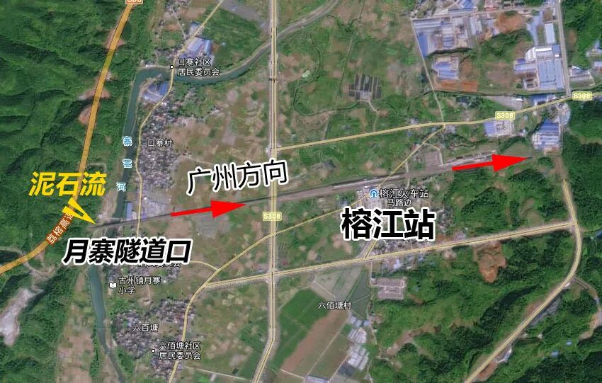 地图显示,从月寨隧道口到榕江站中心点距离1.7公里。