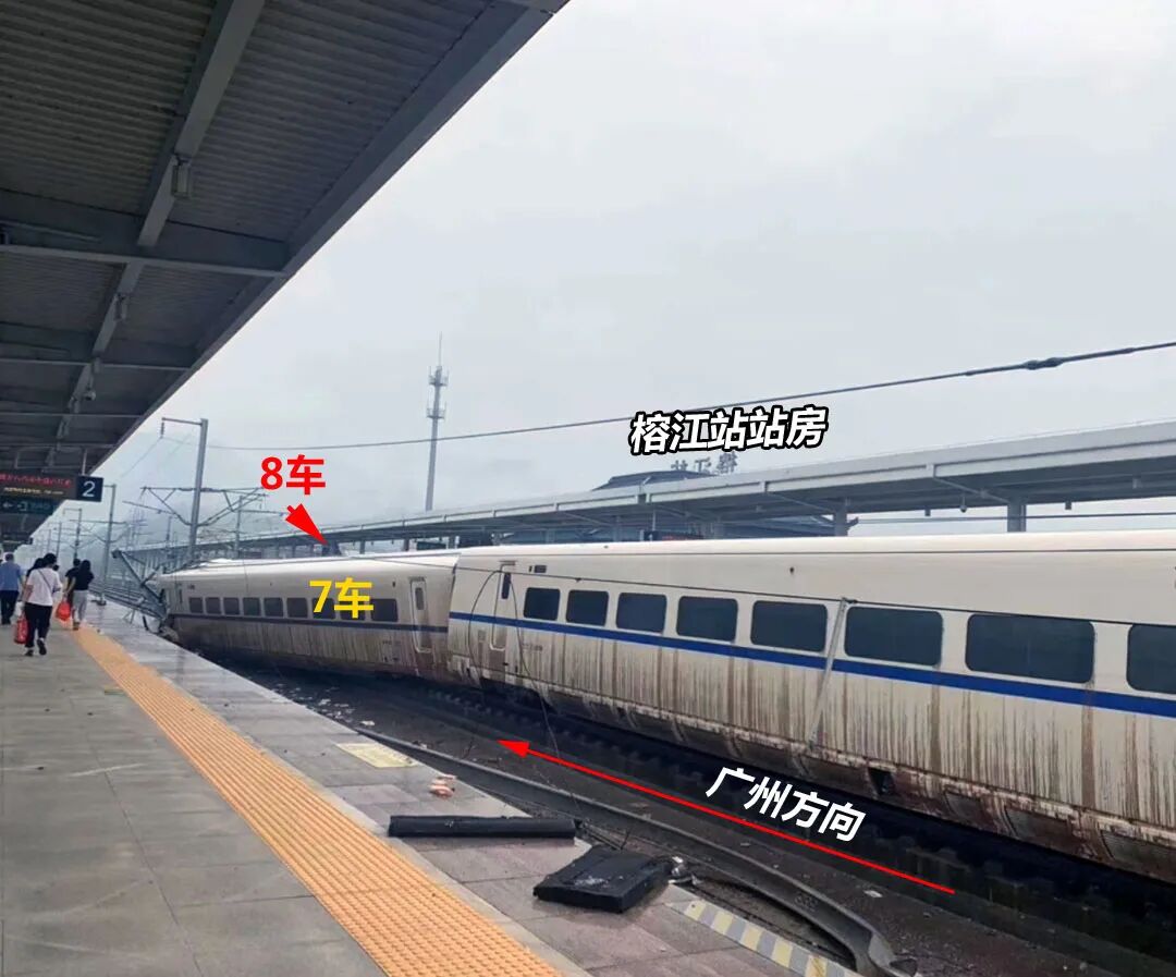 原本以250公里时速快速行驶的动车,在局部脱轨后经过一路减速最终低速进入榕江站。