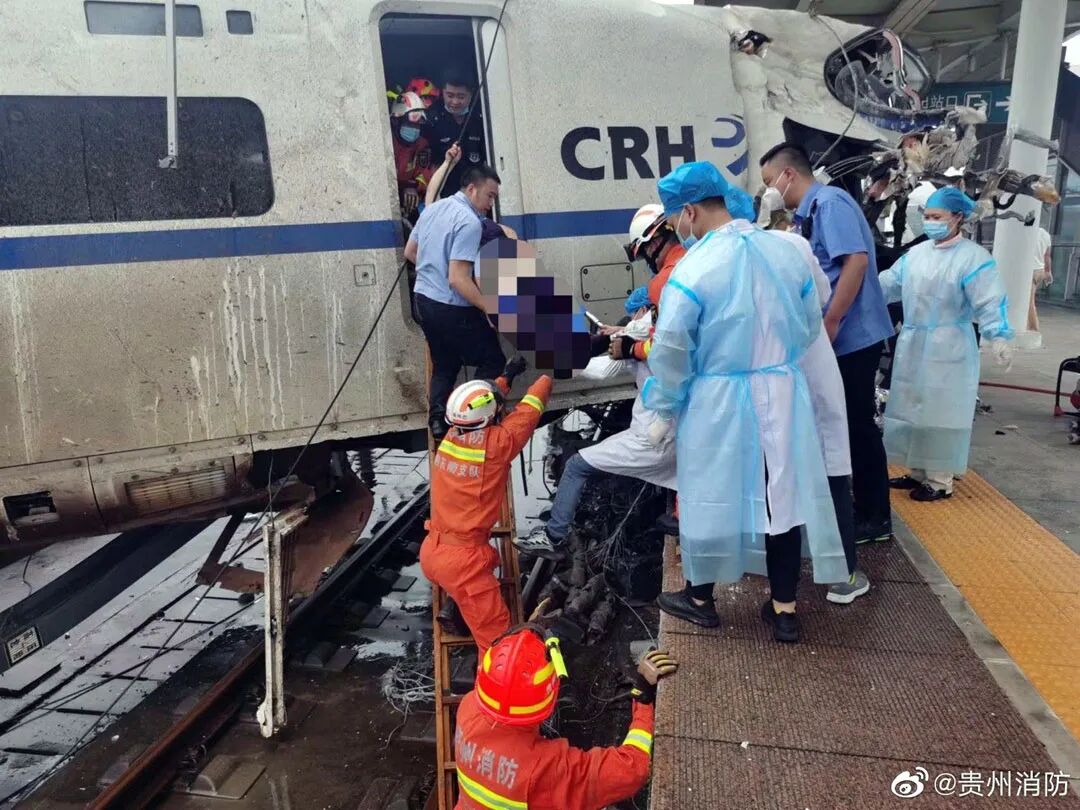 北京时间10点21分左右,动车D2809次在贵广客专贵州榕江站发生事故,列车车头冲出轨道并严重受损。