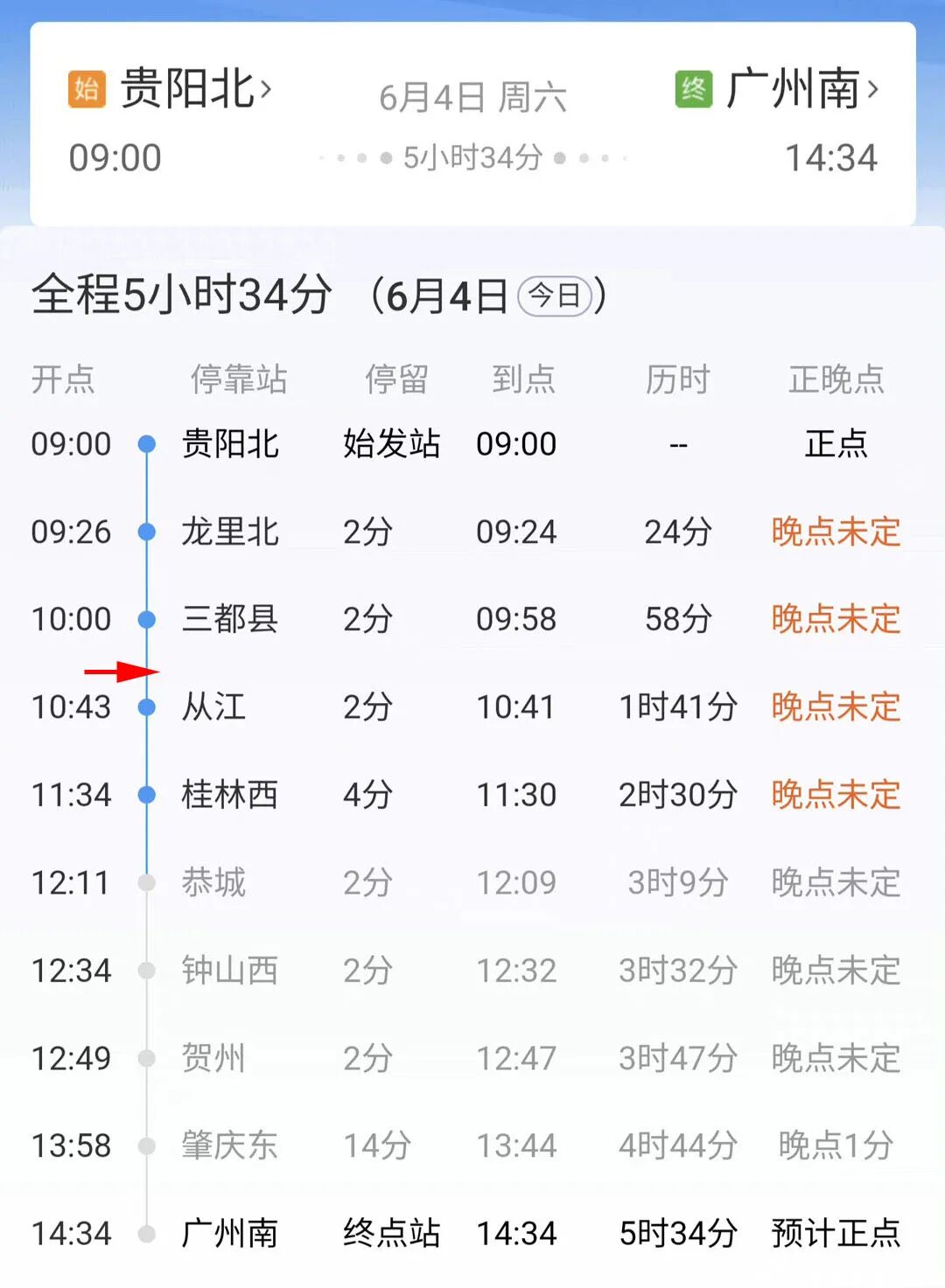 动车D2809次为贵阳北至广州南,图定贵阳北始发时间9:00,10:41停靠从江站,14:34抵达广州南。