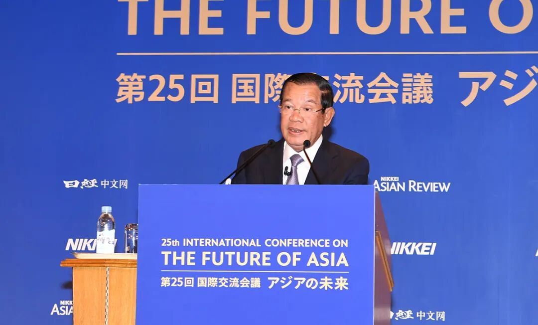 ▎柬埔寨首相洪森在东京举行的第25届“亚洲的未来”会议上发言 图源:柬埔寨政府部门官网