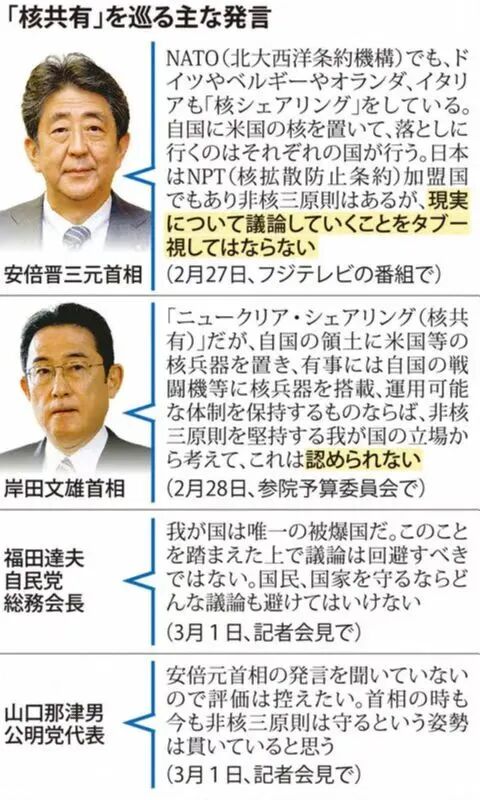 非核三原则(不持有、不制造、不引入核武器)曾长期被视为战后日本国策,然而今年以来,日本政坛不断有人试图打破禁忌,鼓吹日本拥核。2月27日,日本前首相安倍晋三在电视节目中称,日本应该对日美核共享问题加以讨论,3月6日,自民党政调会长(负责政策研究的核心部门)高市早苗公开声称,应就非核三原则中的“不引入”展开党内讨论。虽然现任首相岸田文雄在接受参议院质询时,以“核共享”问题与非核三原则存在抵触为由,拒绝将其提上议事日程,但事实上,核共享已经成为日本政界热议的话题,在野党中,日本维新会支持讨论“核共享”,立宪民主党、日本共产党则表示反对。![]()
