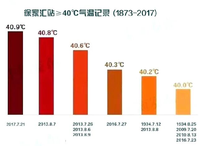其中1934年2天、2009年1天、2010年1天、2013年5天(8月上旬40度四连击)、2016年2天,2017年3天。绝大部分都发生在近年。