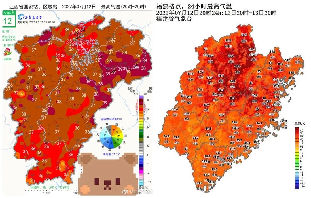 在福建北部,最高气温也突破或接近40℃。相比之下,广东广西常见的35℃高温天气就算不了什么了。