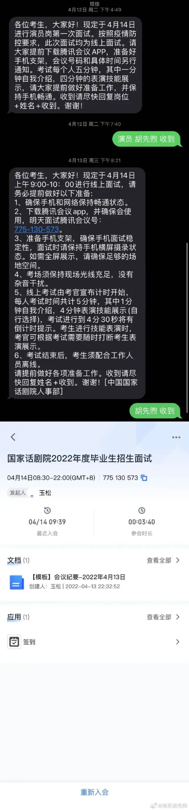 胡先煦发文晒出多项证据,力证自己考编合规,并表示“将永远接受大家的监督”。大概从8岁开始,就慢慢习惯了每天录制自我介绍视频,对着父亲的镜头一字一句报告自己的姓名、年龄、身高、体重、籍贯等等事无巨细,以供挑选和比较。直到现在,用半年以上的时间准备一次试镜来争取一个角色的情况也时时会有。所以对于每一次机会,我总是无比珍惜和重视。本以为这次报考国家话剧院,也是人生中又一个无比重要却也无比平常的考试之一,却没想到,造成了这么激烈的讨论。这一周,我如坐针毡,无数次焦急地希望站出来解释与澄清,但公示期间官方正在就此进行复查和审核,我不能因为个人的发声去影响整体复查和审核的过程。现在,针对这段时间部分网友对我的质疑,我进行如下说明:一、2022年3月29日,我正式报考中国国家话剧院演员岗位。报名邮件见图1;二、2022年4月12日,我收到第一次面试的短信通知,并于4月14日完成线上面试。通知短信及线上面试会议截图见图2;三、2022年4月18日,我收到成功进入第二次面试的短信通知,并于4月22日乘坐高铁前往北京参加4月24日的线下面试(此时我所在地歙县14日皆内无新增疫情通报,但因收到短信通知时已无法购买到北京的直达票,所以选择在沧州西进行中转,期间并未出站),通知短信及高铁票、购票记录见图3;四、2022年4月26日,我收到成功进入第三次面试的短信通知,但因刚往返于北京,我的安康码变为黄码,需要按照当地防疫政策完成“三天两检”。我通过电话反馈该情况。4月28日我的黄码刚刚解除之际,得知我当时所在地歙县检测出2名新冠病毒感染者,而此时北京的进京政策为“14日内有新增本土新冠病毒感染者所在县旅居史人员严格限制进返京”,于是我只得按通知短信中“若因疫情防控确不能到场”情况,再次通过电话沟通的方式进行汇报,于2022年4月29日收到线上面试的通知,并于5月2日完成线上面试(当天确有拍摄工作,但是我的拍摄安排是夜戏,也就是在19:00后太阳完全落山后才开始拍摄,我收到的面试通知时间为14:30-16:00,面试正式开始的时间为15:16,所以并未因此影响面试),通知短信、线上面试会议截图见图4,安康码黄码、所在地疫情通报、北京进京政策见图5。![]()