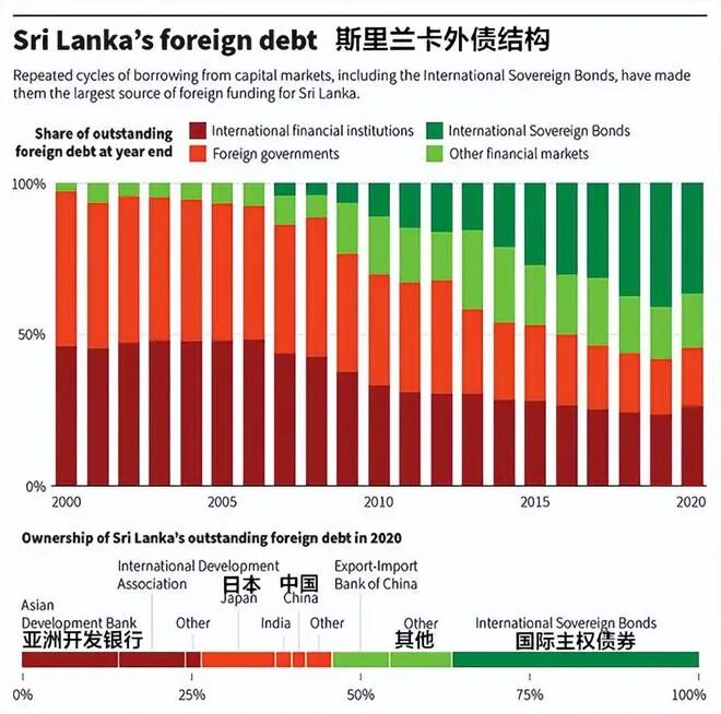 斯里兰卡500亿美元的外债,多达47%是通过国际资本市场,以主权债务的方式借的,剩下9%和13%分别是世界银行和亚洲开发银行的优惠贷款。