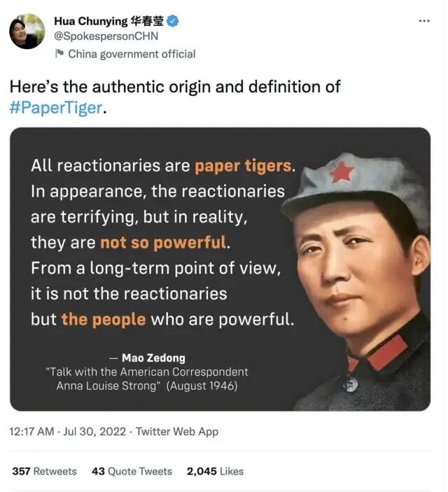 “All reactionaries are paper tigers. In appearance, the reactionaries are terrifying, but in reality, they are not so powerful. From a long-term point of view, it is not the reactionaries but the people who are powerful.”(一切反动派都是纸老虎。看起来,反动派的样子是可怕的,但是实际上并没有什么了不起的力量。从长远的观点看问题,真正强大的力量不是属于反动派,而是属于人民。)1946年8月6日,毛泽东在延安杨家岭接见了美国记者安娜·路易斯·斯特朗 。当时,大家谈到了第二次世界大战后世界的格局和中国的战局,毛泽东在这次谈话中发表了“一切反动派都是纸老虎”的著名论断。7月30日,中国《人民政协报》发表“佩洛西若窜访成行,大陆将对台采取断然措施”的文章。而至于对美台会采取何种反制和措施,一位不具名的解放军战略学者表示,道义和法理在中国大陆一边,在符合国际法和联合国宪章范围内,中国政府和军队可以采取一切手段,当然远远不像近日海内外媒体说的区区那几种,手段比媒体说得要多得多。这位学者坦言,只要美台敢踩大陆给他们画的红线,我们将启动反分裂国家法,以雷霆万钧之势对台出手,让国家完全统一的步伐大大提前,“可以负责任地说,我们说到做到。”7月29日上午,解放军陆军第80集团军官方账号发布微博:“备战。”![]()