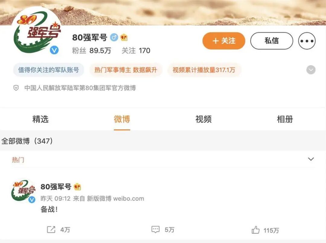 微博发出后仅4小时就有超5万网友点赞,截至目前已有115万网友点赞。随后,该账号发布评论:“家国天下事,社稷一戎衣。属于军人的节日即将到来,我们必须牢记备战打仗这一根本职责,冲锋在强军征程上!”对于佩洛西可能乘军机窜访台湾。白宫国安会官员29日表示,这是美国高级官员的例行访问安排,并不代表拜登政府对佩洛西访问的认可。白宫还表示,目前没有看到有具体的迹象显示中国军方已经对佩洛西可能的访问采取行动。白宫国安会战略沟通协调员 柯比:我们还没有看到有具体的迹象显示中国军方有任何行动,你问我们会如何响应?事情还没有发生,我不妄加揣测。另外,美国前总统特朗普当地时间7月29日公开就佩洛西可能访台一事发声,他在社交媒体上写道:“为什么南希·佩洛西要插手中国大陆和台湾那些事,而不是赶紧为她可能涉及幕后交易和信息的欺诈的丈夫找点麻烦和弄更多的钱?”特朗普称,只要是被佩洛西接触到的都会导致混乱和破坏。她不应该搅和进台湾事务,“她只会让事情变得更糟!特朗普还连打三个感叹号表示,“她真是一团糟!!!”往期好文推荐👇