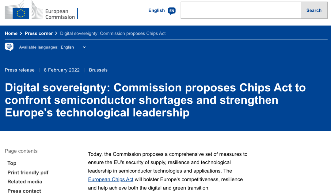 欧洲情形也类似,今天其产能全球占比仅剩9%,出于同样的担忧,欧盟委员会于今年2月8日推出了《欧洲芯片法案》(European Chips Act),拟动员约480亿美元的投资强资助芯片制造和研究。
