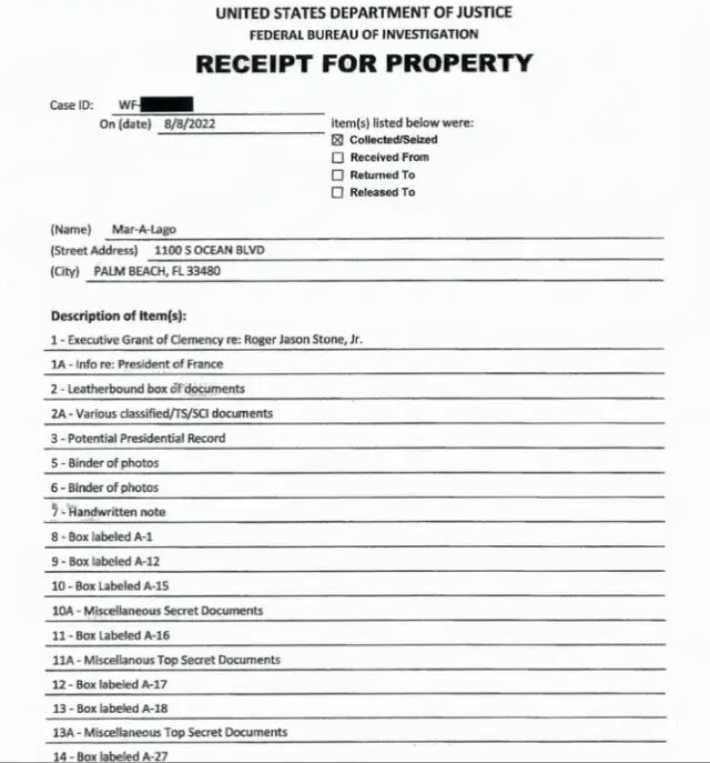 收据显示,FBI取走了11份机密文件,其中一部分被标记为“绝密”文件。