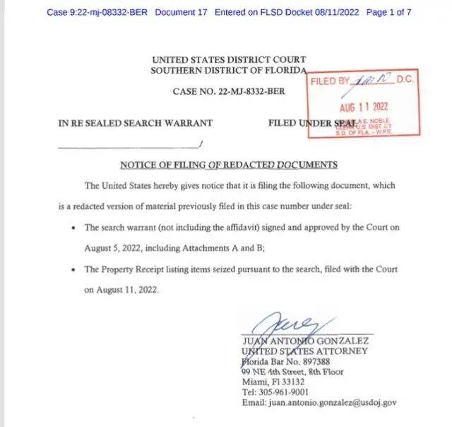 FBI特工日前突查前总统特朗普的私人庄园,寻找与核武器有关的文件。12日,美国佛罗里达州南区地方法院公布了本周早些时候FBI搜查前总统特朗普位于棕榈滩的海湖庄园的搜查令和没收财产收据。