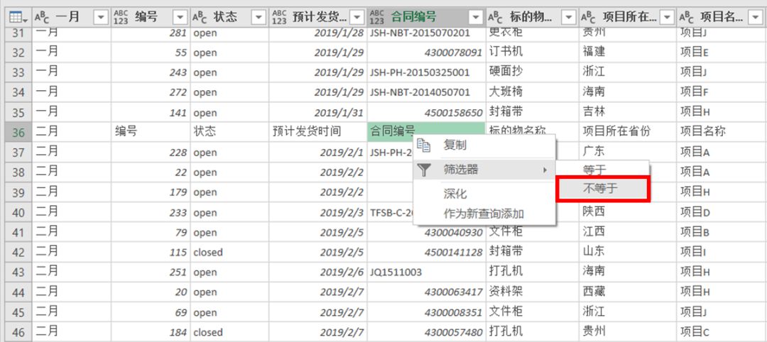 ❶ 新建文件,依次单击【数据】-【新建查询】-【从文件】-【从工作簿】,导入相应的工作簿文件。❸ 这里我们可以看到后三列数据,Sheet、Sheet 的名称,都是多余的,可以直接删除。❹ 然后点击「Data」右侧的小图标,展开我们需要的数据。这个时候可以看到,展开后的数据,标题行和我们想要的不一样,下方第一行的数据才是我们想要的标题:这样标题也 ok 了,数据合并也 ok 了,是不是可以完事啦?由于我们的「暴力合并」,表格中还会躲藏着一些重复的标题行!我们选择任意一个重复的行,任选一个单元格,右键【筛选器】-【不等于】,所有重复的行都被删除啦~虽然步骤有 5 步,但整个过程完全是傻瓜式操作,简单易上手!用 Power Query 合并工作簿的步骤也类似~❶ 新建文件,依次单击【数据】-【新建查询】-【从文件】-【从文件夹】,导入工作簿所在文件夹,点击【确定】-【转换数据】。❷ 然后我们会看到类似这样的界面,这里我们只需要第一列的「Content」数据(也就是每个工作簿里的内容);后面的工作簿名称、创建时间、文件路径 balabala,都不需要,直接删除就好。所以我们选中第一列,依次单击【删除列】-【删除其他列】:=Excel.Workbook([Content])