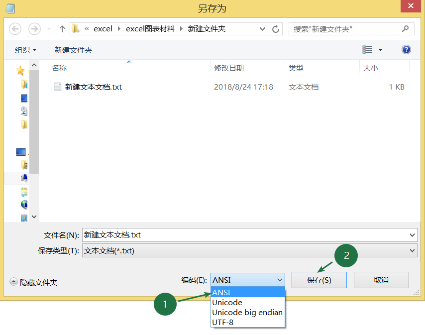 ❷ 单击记事本左上角的文件-另存为,左下方的编码下拉列表中选择「ANSI」,然后单击保存,并关闭记事本;