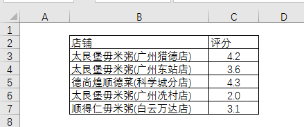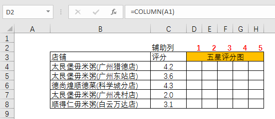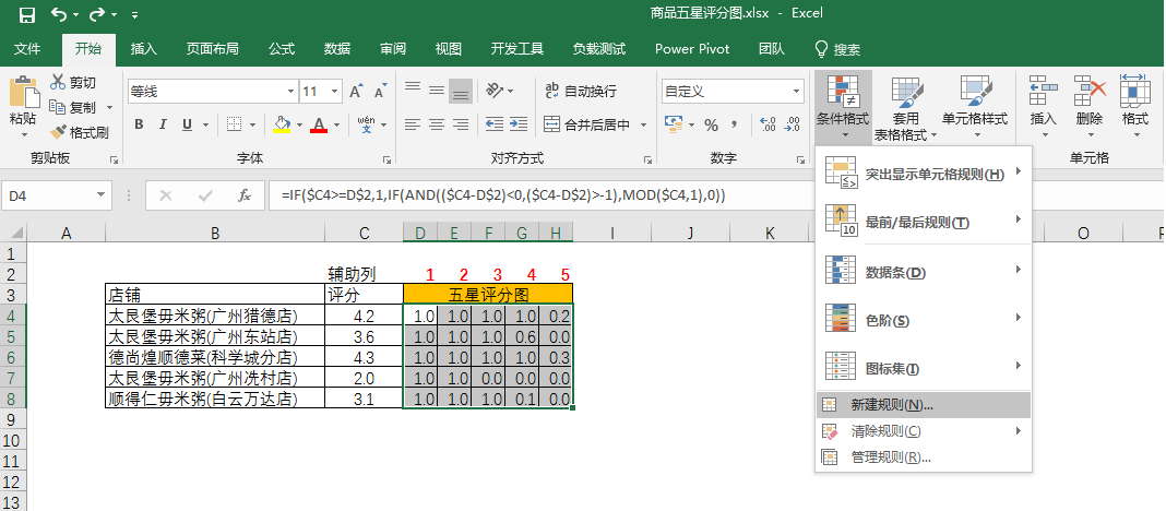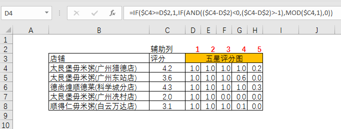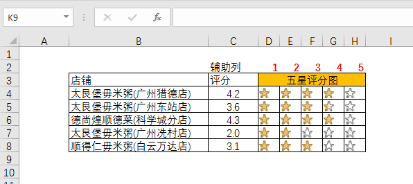 如上图所示,我们先整理好各个店铺的评分,设定好五星评价的显示规则:
