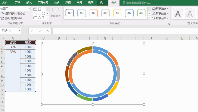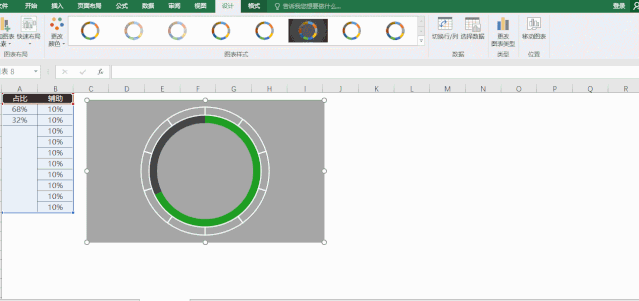 但,这次在创建圆环图时,要同时选中包含了 68% 和 32% 的真实指标数据,以及刚刚添加的辅助数据,这样才能生成两层圆环。