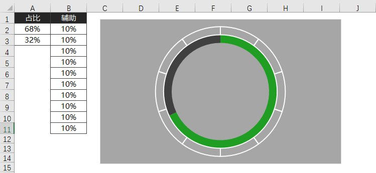 内层圆环包含两段,分别是指标完成度 68% 和代表未完成部分的 32%,而外层圆环就是由 10 个辅助数据,生成的 10 段扇形。