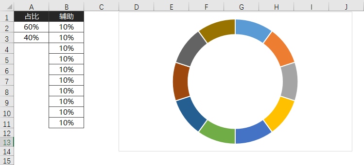 ❶ 设计 10 个一组的辅助数据,每个数据大小都是 10%,选中辅助列数据,插入圆环图。