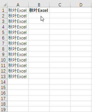 操作方法:输入数据,按【Ctrl+Enter】键,依旧会选中当前单元格,按【Ctrl+B】加粗就行。如果需要在连续的单元格内输入同样的内容,最常见的,是下拉填充。但今天,我们来讲讲另一种方法,【Ctrl+Enter】法。选中需要输入相同内容的连续单元格,输入「秋叶 Excel」,按【Ctrl+Enter】一键完成填充。填充连续的单元格学会了,那么,怎样填充不连续、无规律的单元格呢?聪明的小伙伴想必都知道,可以定位「空值」,选中所有空格后批量填充。① 选中表格区域,按【Ctrl+G】调出【定位】窗口-【定位条件】,选择「空值」-【确定】;② 输入「秋叶 Excel」,按【Ctrl+Enter】即可。① 在第一个合并单元格内输入函数公式,选择合并单元格区域;② 将鼠标光标放到函数公式处,按【Ctrl+Enter】就好了~按【Alt+Enter】键强制换行,【Tab】键和【Enter】键组合快速换行,【Ctrl+Enter】键批量录入数据或公式。在 Excel 单元格内强制换行相信你们已经学会了,那么,有同学知道怎样批量强制换行、批量清除换行吗?知道的同学,欢迎积极在评论区留言说出来;不知道的,可以看看这篇文章:好啦,以上就是本期内容。点个「分享」,让更多人学到有用的 Excel 技能吧~