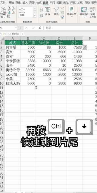 ❶ 【Ctrl+C】——复制; ❷ 【Ctrl+V】——粘贴; ❸ 【Ctrl+Home】——回到 A1 单元格; ❹ 【Ctrl+Shift+→】——向右选中数据区域; ❺ 【Ctrl+Shift+↑】——向上选择数据区域; ❻ 【Ctrl+↓】——向下到达数据边缘; ❼ 【Ctrl+↓+→】——回到数据区最右下角; ❽ 【Shift+↓】——向下选中数据区域; ❾ 【Alt】-【A】-【S】-【A】——升序。