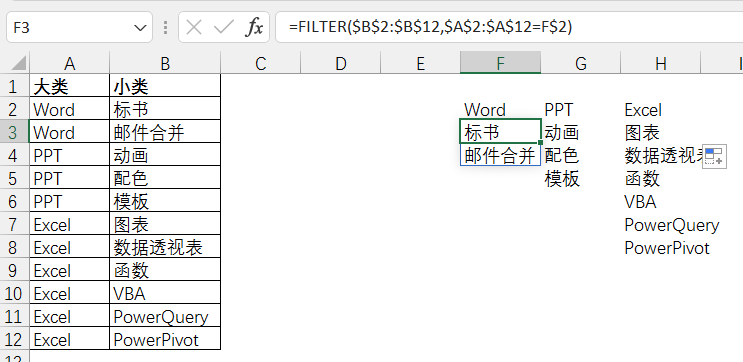 =FILTER($B$2:$B$12,$A$2:$A$12=F$2)① 要筛选的数组或区域:$B$2:$B$12 小类列。