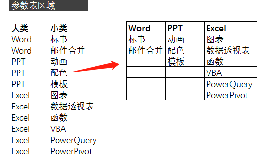 如下图,左边为参数表区域,现在我们要做成右表的形式: