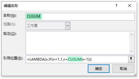 在名称管理器中,新建定义一个名称为「CUSUM」。